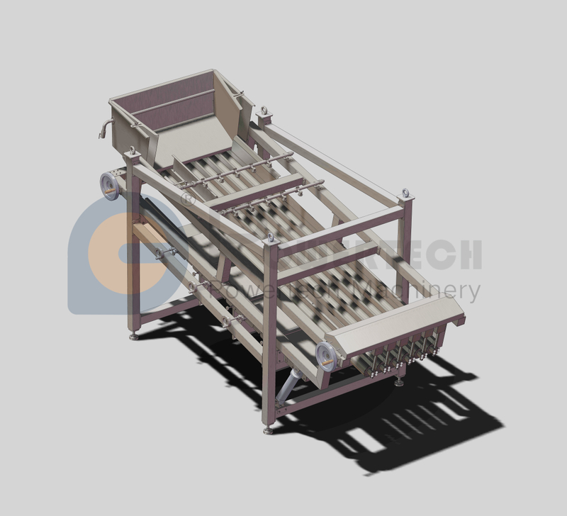 FastGrader B鱼分级机通过旋转的辊子和水淋的方式,使原料鱼以一定的角度向下滑落,掉落到辊子之间的间隙里后达到分级的目的。可以通过机器一侧的轮子来按照客户的规格分级要求,调节辊子之间的间隙,最多可分级五个规格。