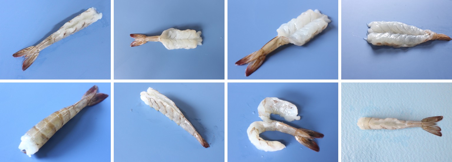 去头虾经自动剥虾机加工后,加工成以下款式: